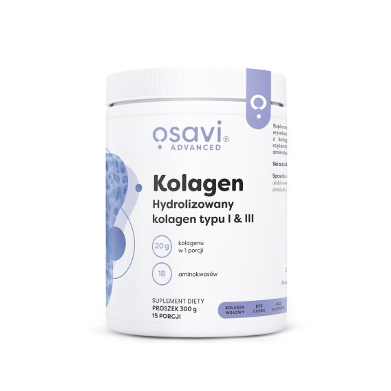 Osavi Hydrolizowany kolagen typu I & III w formie proszku to łatwo przyswajalne, wysokooczyszczone wołowe peptydy kolagenowe o neutralnym smaku i zapachu. Otrzymywane są z kolagenu typu I i III, dzięki czemu zawierają aż 18 aminokwasów, w tym wysokie stężenia podstawowych aminokwasów budulcowych kolagenu: glicyny, proliny i hydroksyproliny. Zawarte w nim peptydy (białka) pomagają w utrzymaniu masy mięśniowej i przyczyniają się do jej wzrostu oraz pomagają w utrzymaniu zdrowych kości.