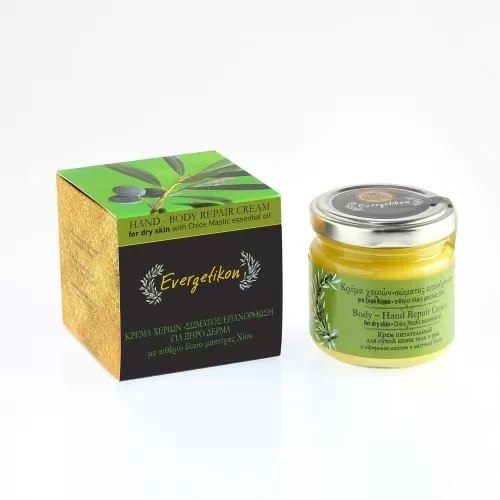 Krem naprawczy intensywnie odżywiający, łagodzący i nawilżający do pielęgnacji całego ciała i dłoni. Zawarty w kremie olejek z żywicy mastyks z wyspy Chios, działa silnie regenerująco i łagodząco na podrażnioną skórę, ponadto ma działanie antybakteryjne i ochronne przed szkodliwym wpływem środowiska. Prunus Amygdalus Dulcis (Sweet Almond) Oil (almond oil), Olea Europaea (Olive) Fruit Oil Cretan extra virgin olive oil, Beeswax, Simmondsia Chinensis (Jojoba) Seed Oil, Calendula Officinalis Flower Oil (calendula οil), Butyrospermum Parkii (Shea Butter), aloe oil, Origanum Dictamnus (extract dittany), Tocopherol Acetate (vitamin E), Rosmarinus Officinalis (Rosemary) Leaf Extract, Citrus Bergamia (essential oil bergamot), Pistacia Lentiscus var. Chia (Chios Masticha). parabenów, silikonów, glikolu propylenowego, olejów mineralnych, etanoloaminy, ftalanów, piżma ksylenowego, triklosanu, metyloizotiazolinonu lub jakichkolwiek innych chemicznych środków konserwujących lub niepotrzebnych dodatków. Producent: Evergetikon