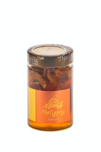 Sosna i krzewy tymianku współistnieją w kreteńskim ekosystemie dając wyjątkowy miód. Dla wzbogacenia smaku dodano chrupiące orzechy włoskie. Przechowywać w chłodnym i ciemnym miejscu. Producent: Meligyris
