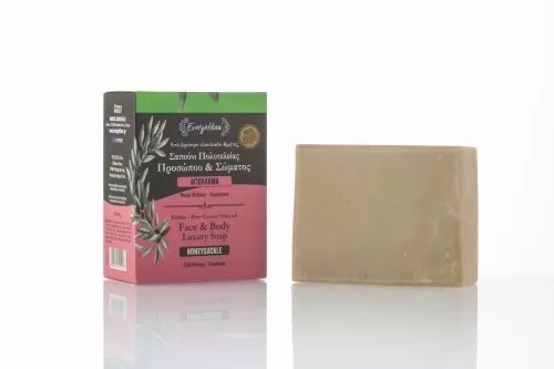 Ręcznie robione mydło do twarzy i ciała, najwyższej jakości, w 100% naturalne. Zawiera spożywczą oliwę z oliwek extra virgin, olej kokosowy, olej migdałowy, ekstrakt z aloesu, wiciokrzewu i rumianku. Dokładnie oczyszcza skórę, nawilża i regeneruje. Mydło wytworzono w procesie tłoczenia na zimno, co oznacza, że oliwa i inne oleje użyte do produkcji nie zostały podgrzane i przez to pozbawione wartości odżywczych. Składniki: Olea Europaea (Olive) Fruit Oil - Cretan extra virgin olive oil, Cocos Nucifera (Coconut) Oil, Agua, Prunus Amygdalus Dulcis (Sweet Almond) Oil, Calendula Officinalis flowers extract, Aloe Barbadensis leaf juice, Honeysuckle Kosmetyki Evergetikon nie zawierają: parabenów, silikonów, glikolu propylenowego, olejów mineralnych, etanoloaminy, ftalanów, piżma ksylenowego, triklosanu, metyloizotiazolinonu lub jakichkolwiek innych chemicznych środków konserwujących lub niepotrzebnych dodatków. Producent: Evergetikon